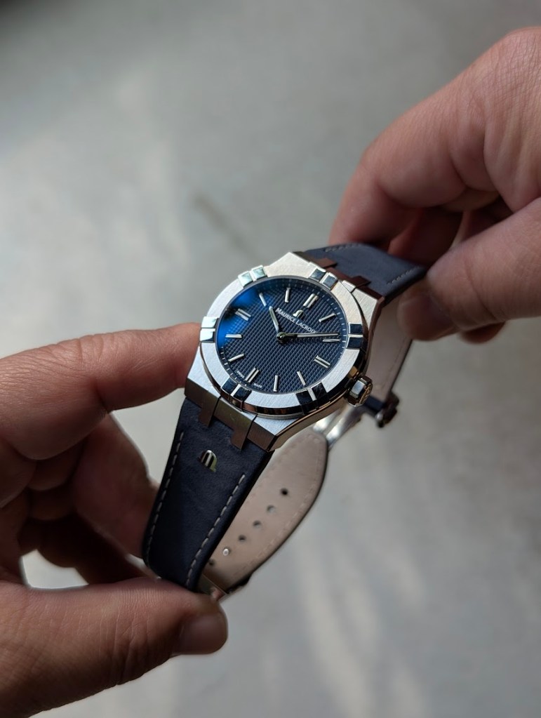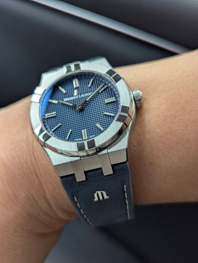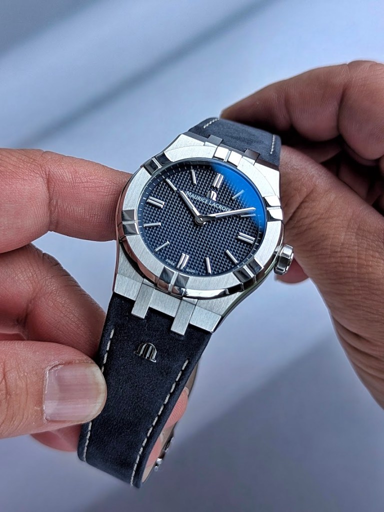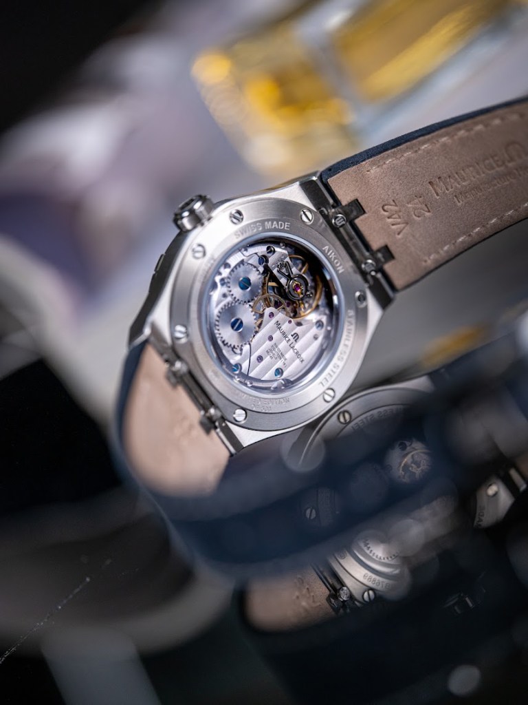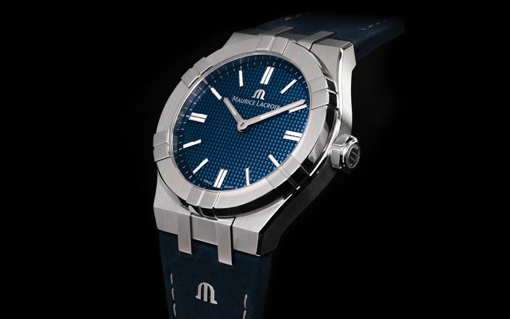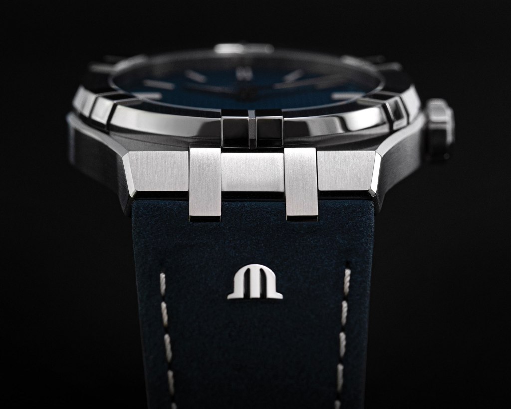 また、モーリス・ラクロアはこのモデルにイージーチェンジャブルシステムを搭載し、ステンレススティール製5連ブレスレットと、ロジウムメッキのMロゴをあしらったブルーのヴィンテージレザーストラップが付属で付いてきます。
